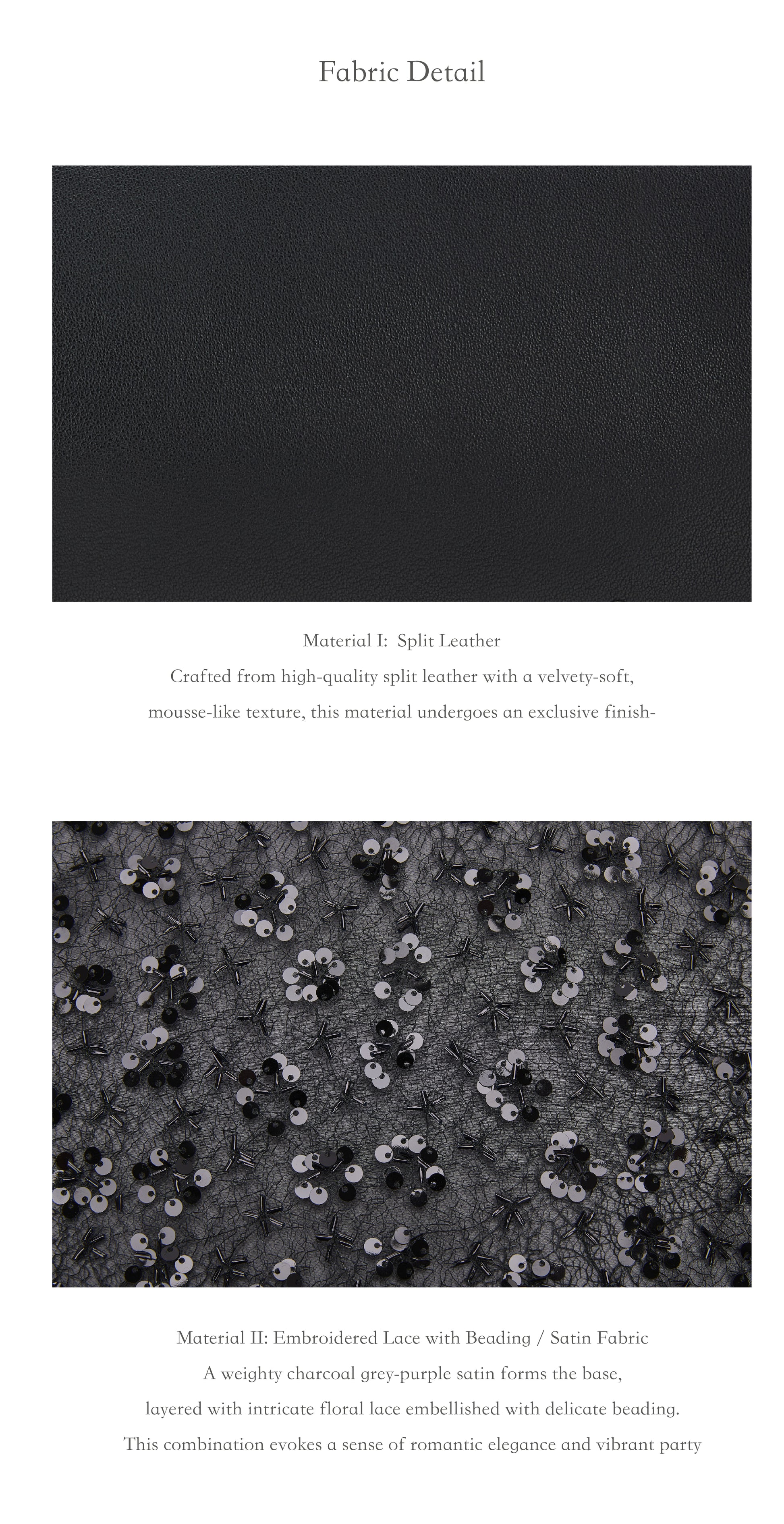 Delicate Floral Lace Beading: Intricate floral-inspired lace and beadwork create a tactile, artistic surface, showcasing meticulous attention to detail.